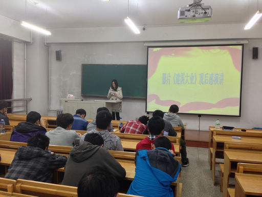 2小时的电影结束,在主持人的建议下,全体学员齐声唱起了国歌。接下来,主持人请了7位学员代表上台和同学们交流自己的观后感。王耀彬同学从电影的历史背景角度谈了谈自己的看法,述说了前辈领导人们为新中国事业前仆后继的事迹,以及自己对未来的展望。哈布尔、童衍辰、廖奕凯三位同学表示对电影本身的细节内容影响深刻,特别是毛主席的话,深刻地反映了前辈们的治国思想。赵夫凡、刘晶晶、季黎明三位同学则结合自身的学习体会经历,阐述了自己对这部电影的看法,他们观点的共同点在于对共产党和国民党的治国思想做了一定的分析和比较,阐述了为何国民党会覆灭,共产党则经历历史考验,逐渐成熟壮大。