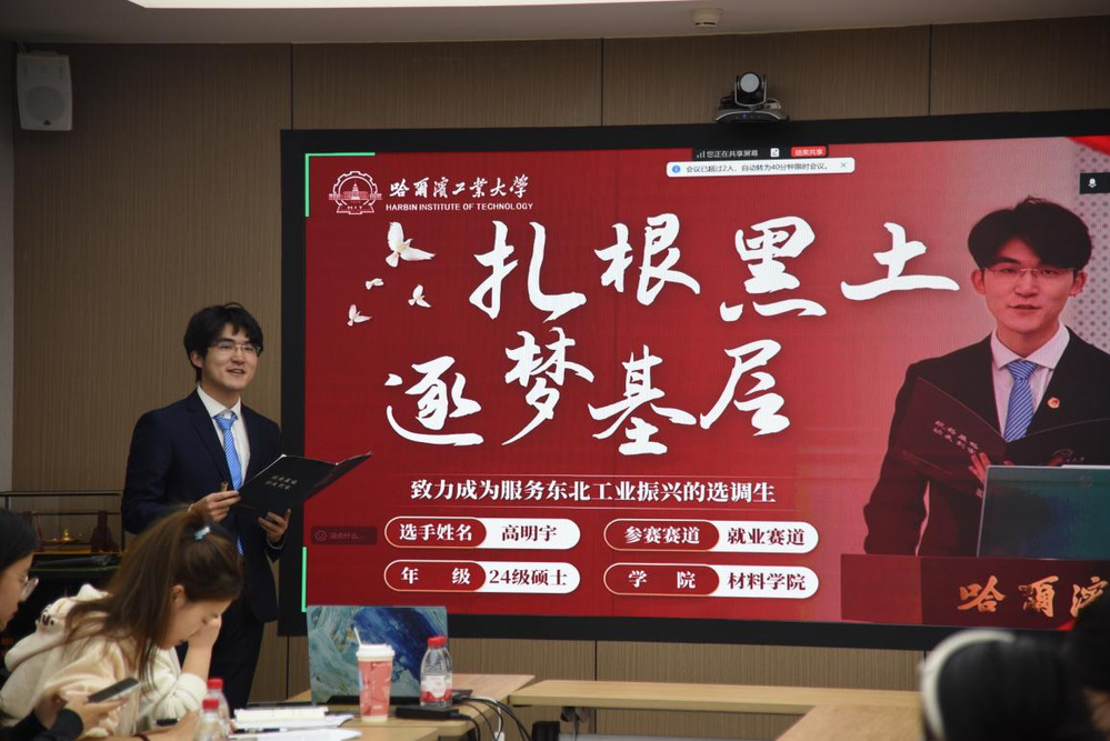 首先进行的是“就业博士生赛道”,选手们结合金属材料、高分子材料、船舱焊接等细分领域特点,从自我认知、行业分析、目标路径等方面展开阐述。然后进行的是“硕士生就业赛道”,其中高明宇同学以“黑龙江省定向选调生”为职业目标,结合当前定向选调生的相关政策与能力要求,系统阐述了自己的职业目标选定及准备方向。最后进行的是“成长赛道”,四位本科生选手通过分析材料学科的发展现状,结合当前行业动态和自身专业知识应用能力,制定了阶梯式规划,获得了评委们的一致认可。
