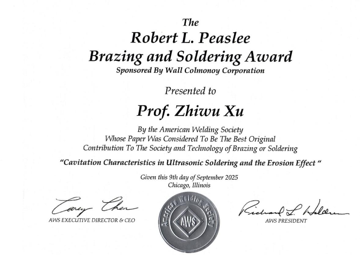 近日,材料结构精密焊接与连接全国重点实验室许志武、闫久春教授团队凭借在超声波钎焊领域的突破性研究,荣获美国焊接学会(AWS2025年度“Robert L. Peaslee Brazing and Soldering Award”。这一荣誉是该团队继20212024年后第三次斩获该奖项,再度获得国际焊接权威机构的认可,标志着我国在超声波钎焊基础理论与应用研究方面持续保持国际领先水平。