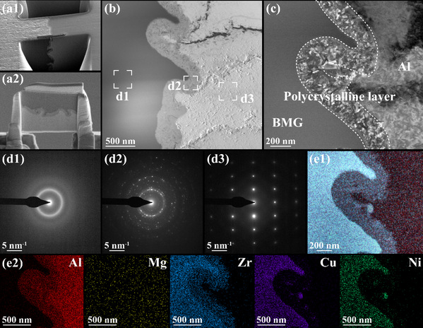 微观机制和机理研究表明,AFSD沉积过程能够对BMG表面引入高比表面积与高能形核位点,并激活非晶结构无序向有序的原子重排,同时在铝侧产生积累大量位错,作为原子快扩散通道驱动铝与锆互扩散并生成纳米多晶层,其平均厚度仅为280 nm。不同于传统异种复合材料依赖IMCs层界面连接,该纳米多晶层具有高晶界密度、多相界面与随机取向等特征,能够促进裂纹偏转与能量耗散,缓解局部应力集中,从而实现更有效的载荷传递,使断裂模式由沿界面脆性剥离向铝侧韧性断裂转变,显著提高复合材料界面结合强度。