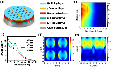 针对这一难题,研究团队利用制造简单、可操纵光场的二维微孔阵列超表面来实现InAs/GaSb二类超晶格长波红外探测器的光谱响应增强。基于此,研究团队首先采用时域有限差分(FDTD)方法调控微孔阵列超表面的几何参数以优化长波红外波段的光学性能,而后利用紫外光刻和干法刻蚀技术实现周期8 μm的微孔阵列超表面与InAs/GaSb二类超晶格长波红外探测器的集成。
